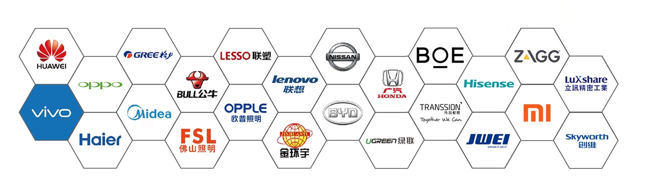 部分客户:华为、步步高、三星电子、京东方、美的、格力、格兰仕、海尔、海信、TCL、联想、传音手机、三星电子、小米;欧普照明、佛山照明、金环宇、联塑、日产、广汽、比亚迪、自格、立讯精密、绿联、聚维、华南理工、中山大学、广测,华测,深圳CCIC,广 州SGS等客户。
